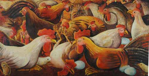 | # WBBB. Wilson Bigaud 17.5"x 49.5" Oil on Masonite " The Rooster Funeral" 1955 $7500 framed in wooden frame with linen liner SALE! $6000 SOLD 12/06 |