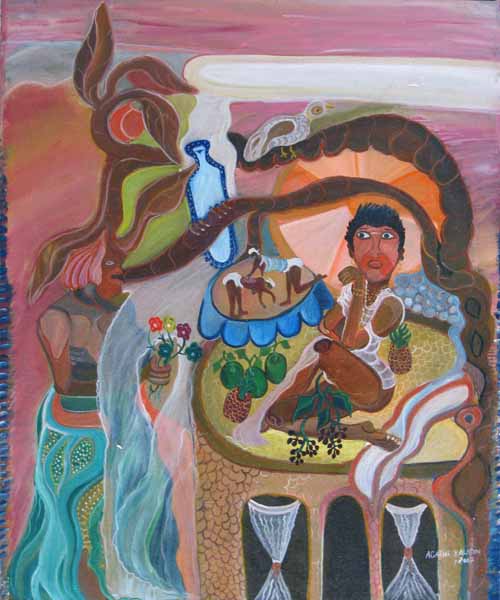 Agathe is one of the seven children of Haitian artist Theard Aladin. She was born on May 25, 1967 and learned to paint by watching her father. Eventually she began to paint on her own. She lives with her husband and three children in Carrefour, Haiti. She describes her painting style as "imaginary free" She is one of the best self taught painters working in Haiti now. Agathe's home was destroyed in the earthquake and the family lived outside under sheets and tarps until she finally found a tent through the good graces of the Partners in Health tent program for artists in mid- May. Thanks to Jenny Dubin. |