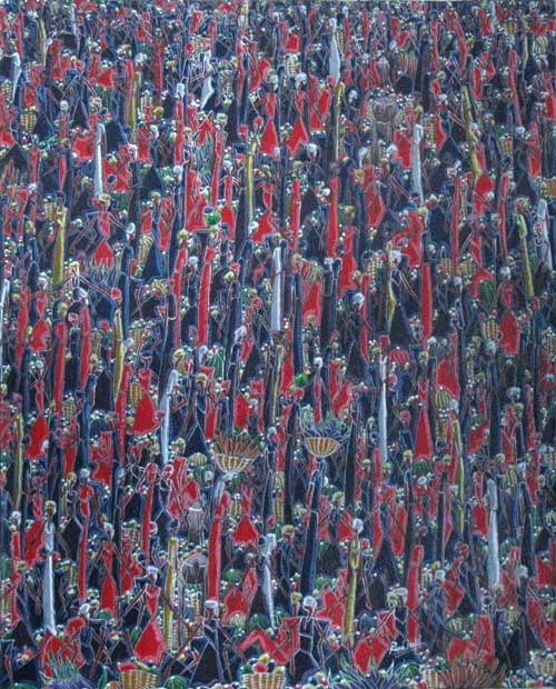 The Art of Haiti by Rene Haspil Rene Haspil was born in Port-au-Prince on March 28, 1954. His father was a negotiator and his mother a dressmaker. He grew up in Martissant, near the house of the original market painter, Laurent Casimir. By age 16 he was a student of Casimir. Around 1988, his own style of market painting began to evolve, one that borders on the abstract. He is proud to say that he has never set foot in a museum claiming that his paintings come only from inside his own head. (CPA). Haspil coats his canvases with plaster and then paints over the dried plaster. This imparts a nice depth to the painting. Sad news, Rene Haspil suffered an incapacitating stroke in the Fall of 2009 |